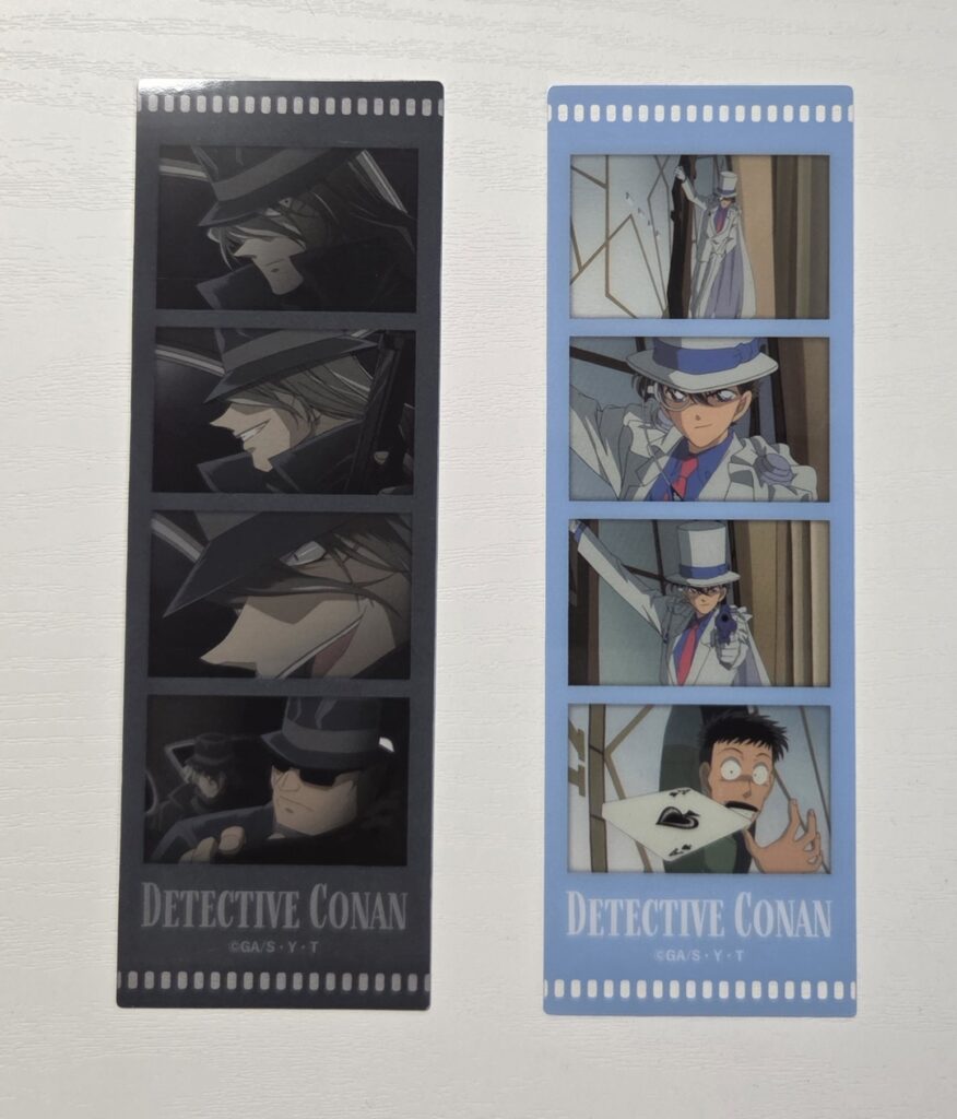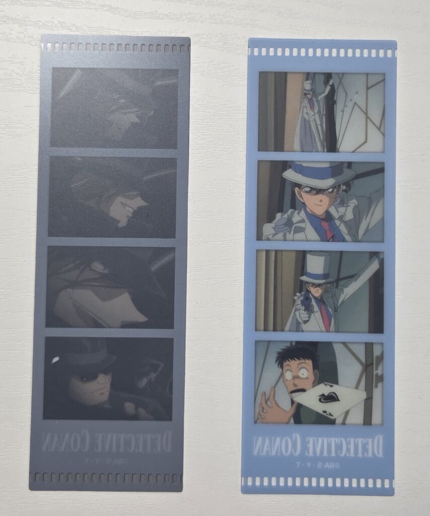 これまでの「ブックマーク」系コナングッズの発展形ともいえる、縦長のクリアカード。スペースを活かした“4カット構成”で、関連シーンが一枚にぎゅっと詰まっています。映像フィルムのようなデザインが特徴です。