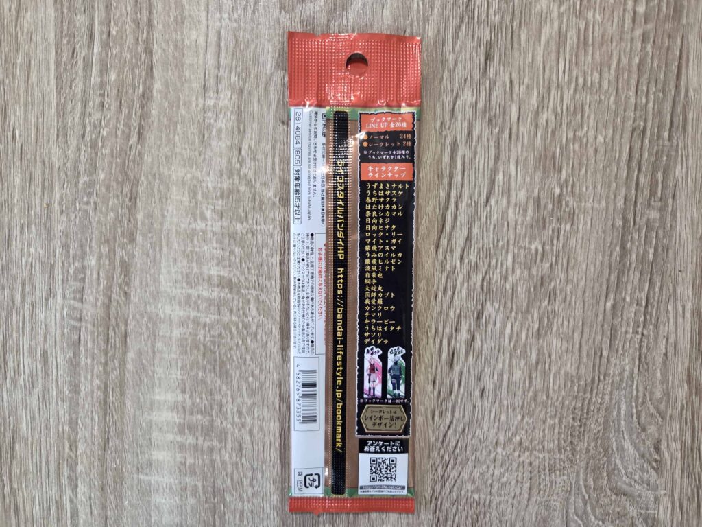 一般的なしおりを想像していると存在感に驚きます。1枚にキャラクターの全身がしっかり描き込まれており、飾って楽しむタイプのアイテムです。シークレットを除く24種がそれぞれ別キャラなので、どれが出ても嬉しいラインナップでした。
