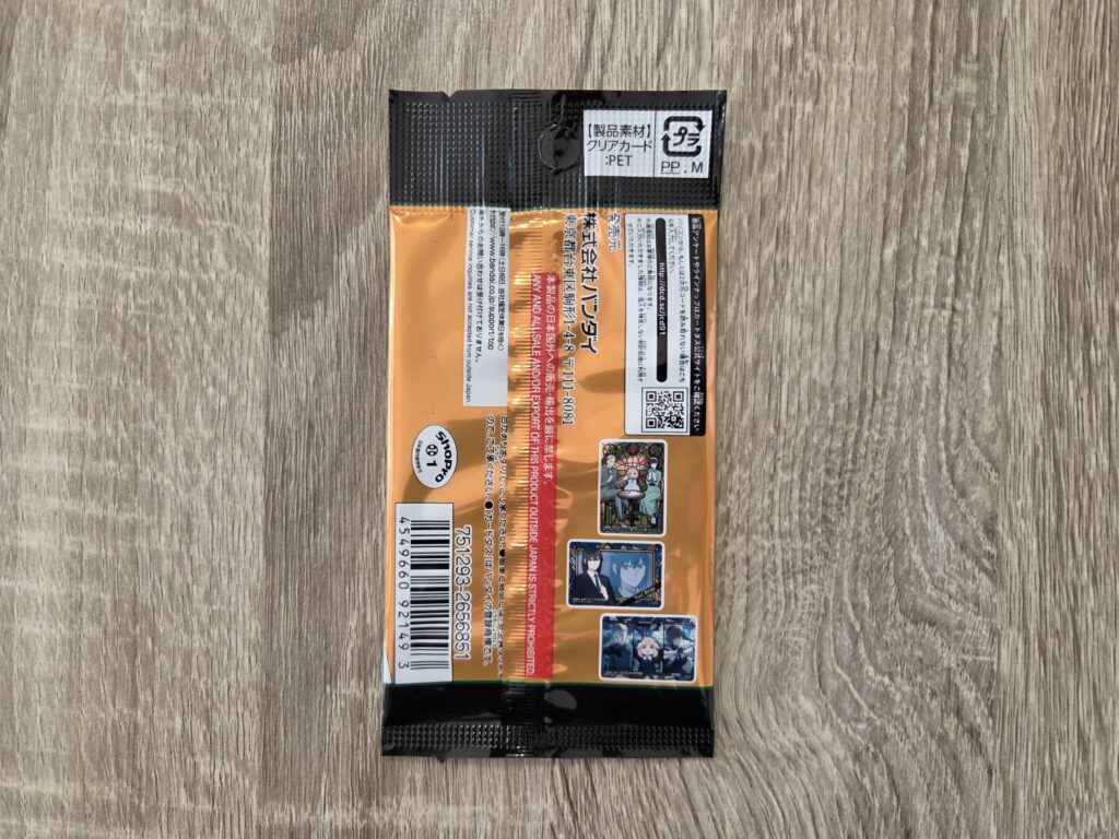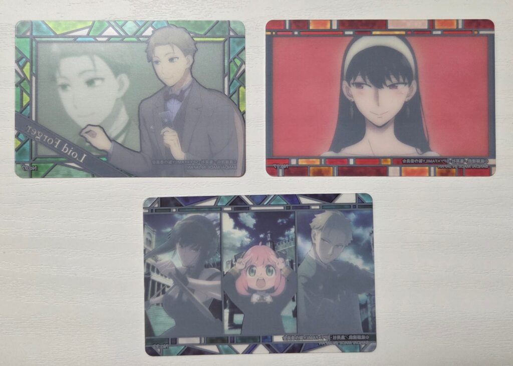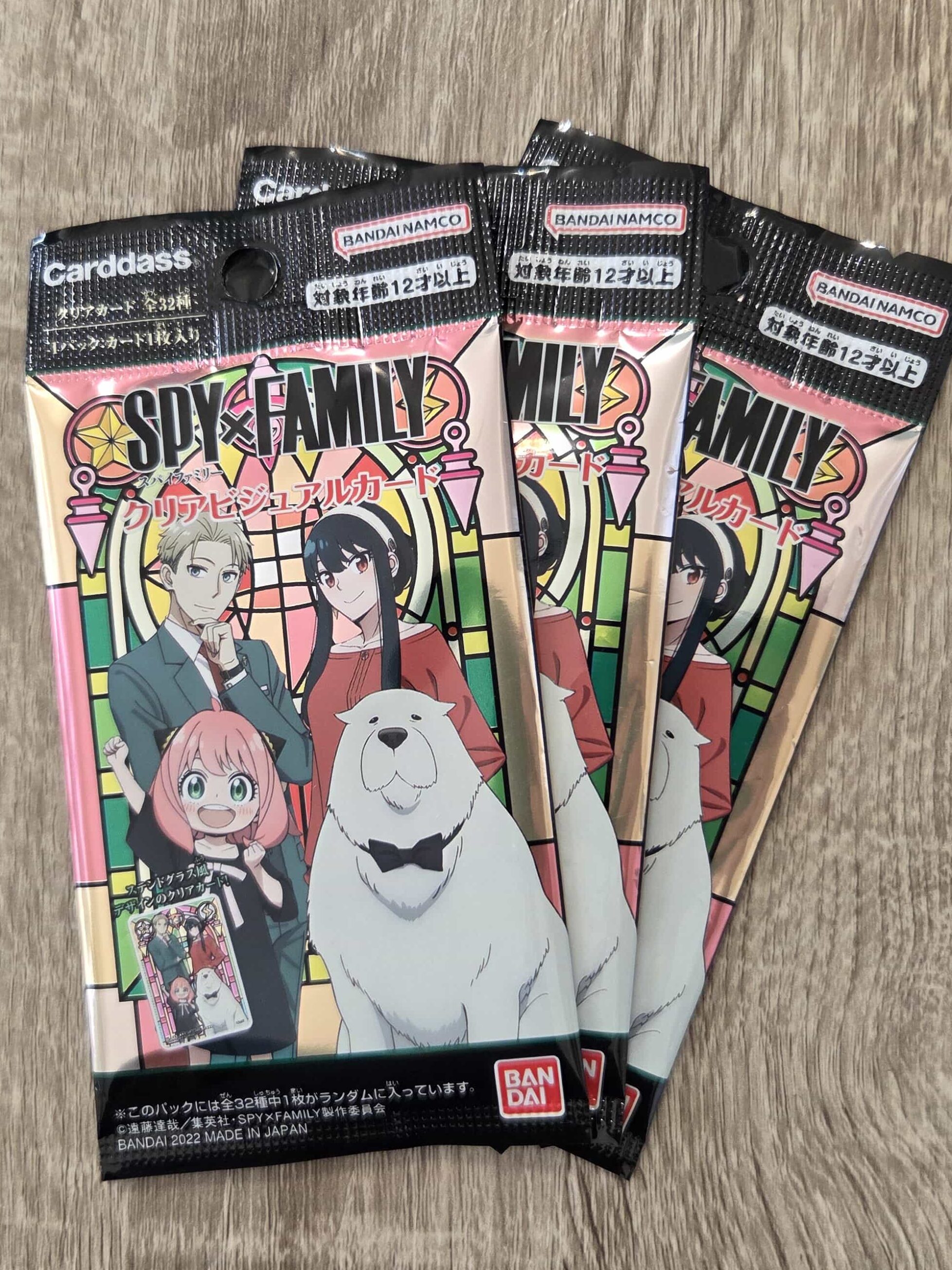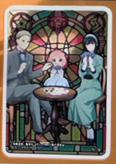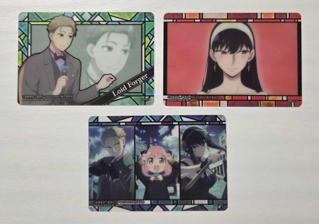 発売時期が2022年11月のため、ラインナップはアーニャ、ロイド、ヨルの3人が中心。ソロデザインが多く、キャラクターごとに雰囲気の違いを楽しめる内容です。個人的にはステンドグラスの柄がしっかり映える「フォージャー家3人のカード」を狙っていましたが、今回は残念ながら引けず…。ただ、3人が映るビジュアルカードは当たったので満足です。